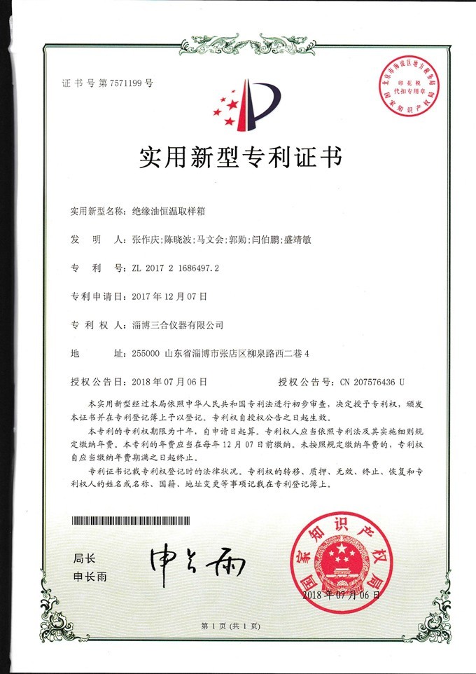 热烈祝贺我公司产品“绝缘油取样箱”发明专利获得国家知识产权局授权。